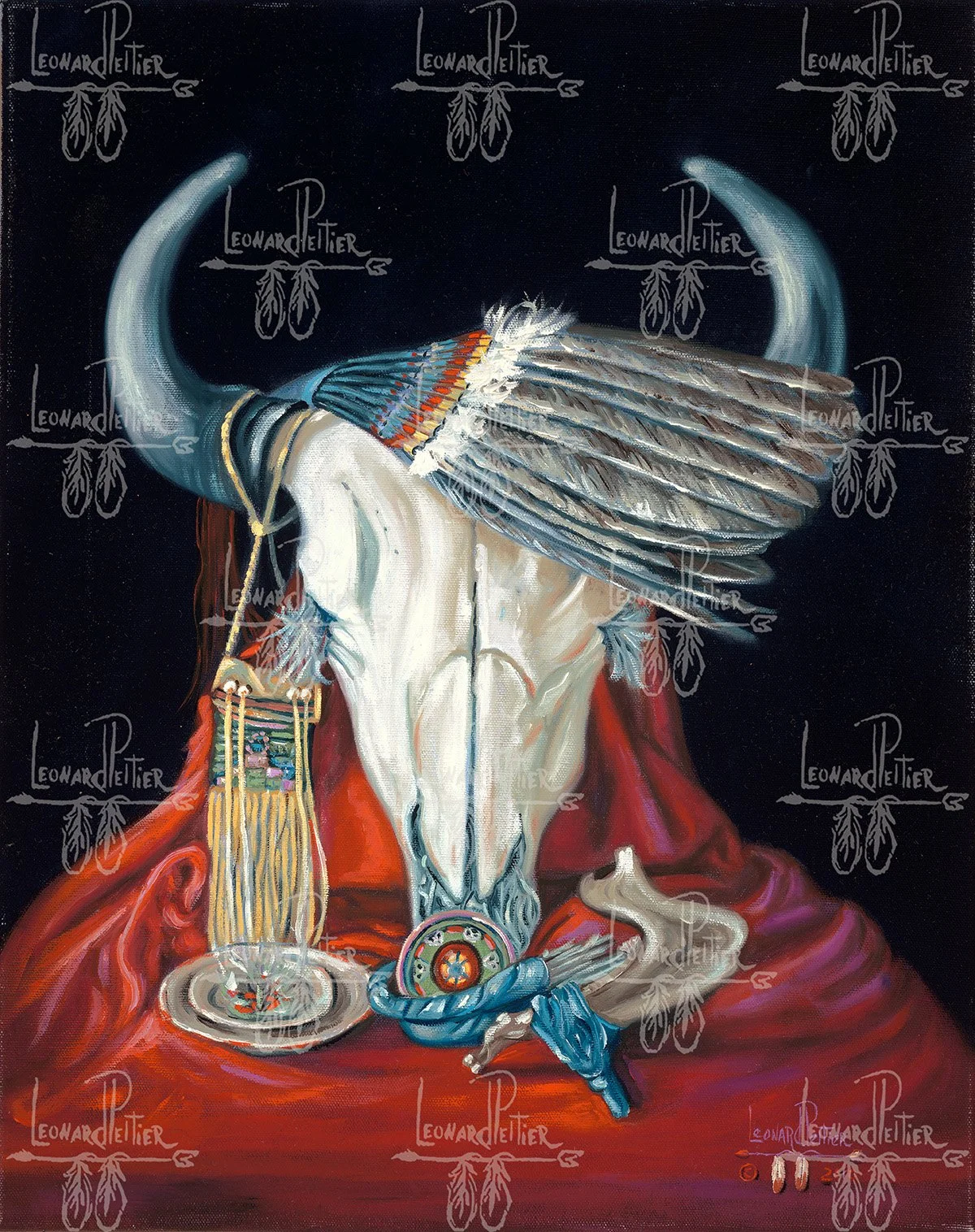 A stark, reverent still life by Leonard Peltier centers on a weathered bison skull, its bleached curve commanding the composition with quiet authority. Surrounding the skull are carefully arranged Native adornments—beaded straps, feather accents, and strips of dyed hide—that speak to lineage, ceremony, and survival. The muted palette and textured surfaces evoke prairie winds and long winters, while deliberate shadows and open space give the objects a ceremonial pause. This work balances memory and endurance, inviting reflection on loss, continuity, and the enduring spirit of Indigenous presence.