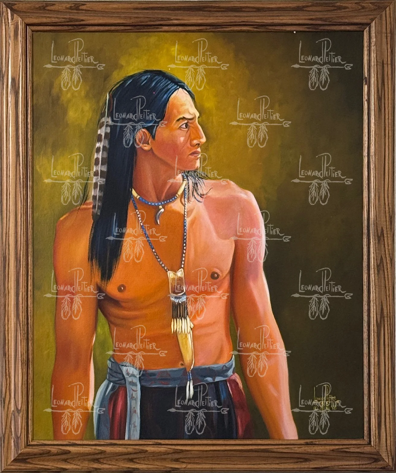 This striking portrait by Leonard Peltier captures the quiet strength and dignity of a young Native man. Through careful attention to detail and a deep sense of respect, the artwork conveys not only the individual’s identity but also the resilience of Native heritage. The composition and expression evoke a powerful narrative of cultural pride and enduring spirit, inviting viewers to reflect on history, identity, and justice.