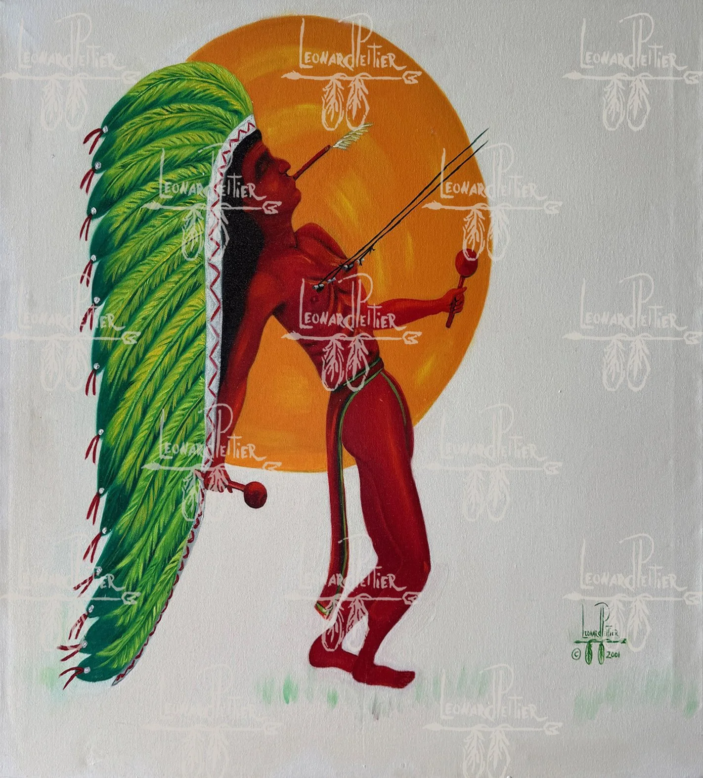 This powerful painting by Leonard Peltier captures a Native American man immersed in a deeply spiritual ritual. Through bold colors and intricate details, Peltier conveys the profound connection between the individual and his cultural heritage, offering a vivid portrayal of tradition, resilience, and identity. The artwork stands as a testament to the enduring spirit of Native American ritual and ceremony.