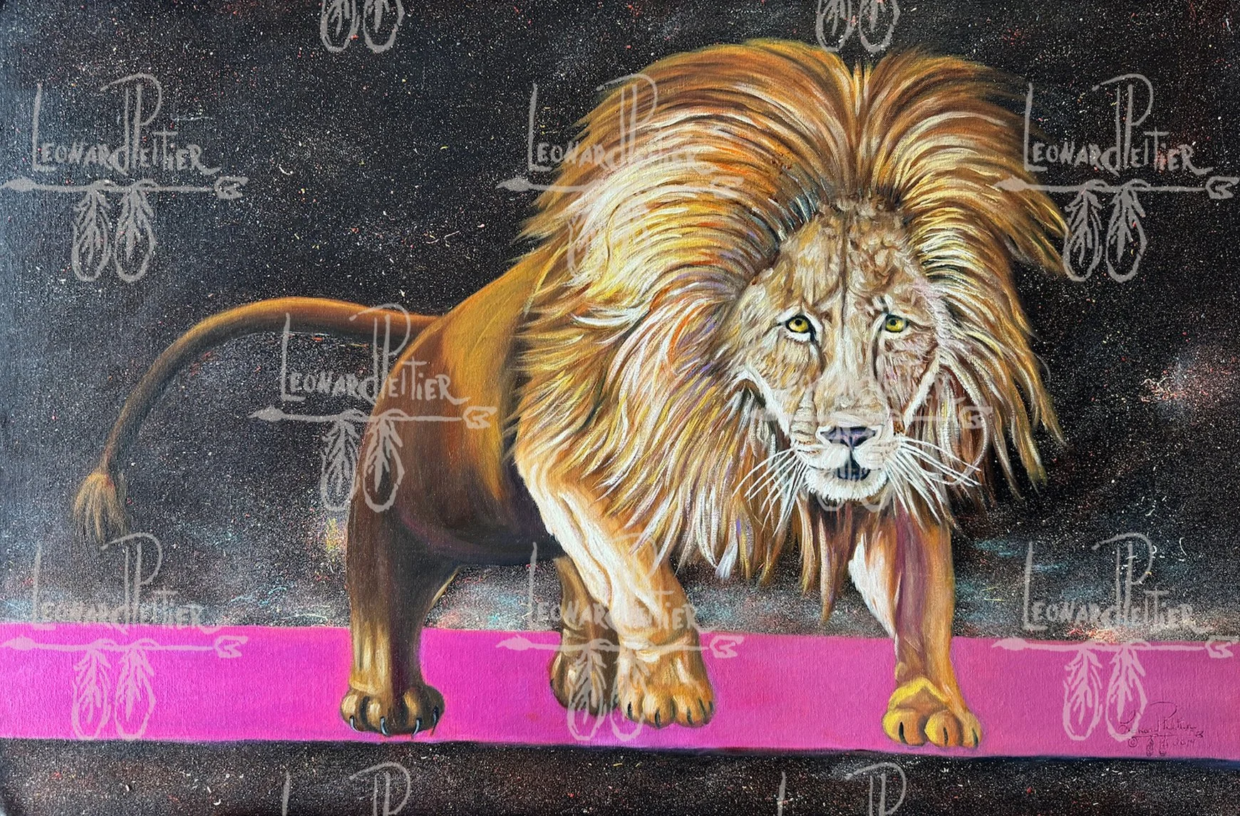 This striking painting by Leonard Peltier captures a lion poised to pounce, blending realism with surrealism. The intense focus of the lion contrasts vividly against a dreamlike backdrop of a starry sky and a bright pink ground, creating a powerful visual tension. The surreal elements infuse the scene with a sense of otherworldliness, inviting viewers to explore themes of strength, anticipation, and the intersection of nature and imagination.