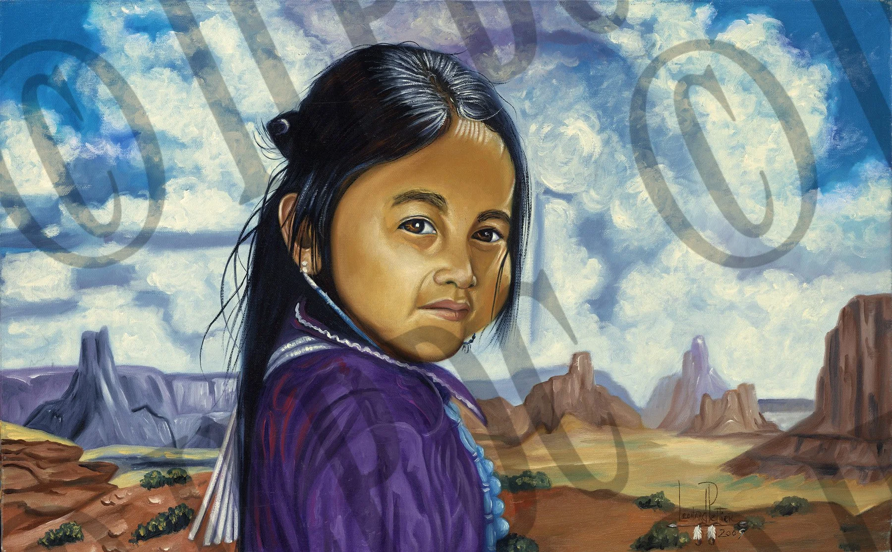 This stunning painting by Leonard Peltier captures a young Native American girl adorned in vibrant purple and turquoise. Her direct gaze engages the viewer with a powerful presence, while the rich Southwest American landscape behind her evokes a deep connection to heritage and the natural world. The artwork brilliantly combines cultural significance with striking visual beauty, reflecting both strength and serenity.