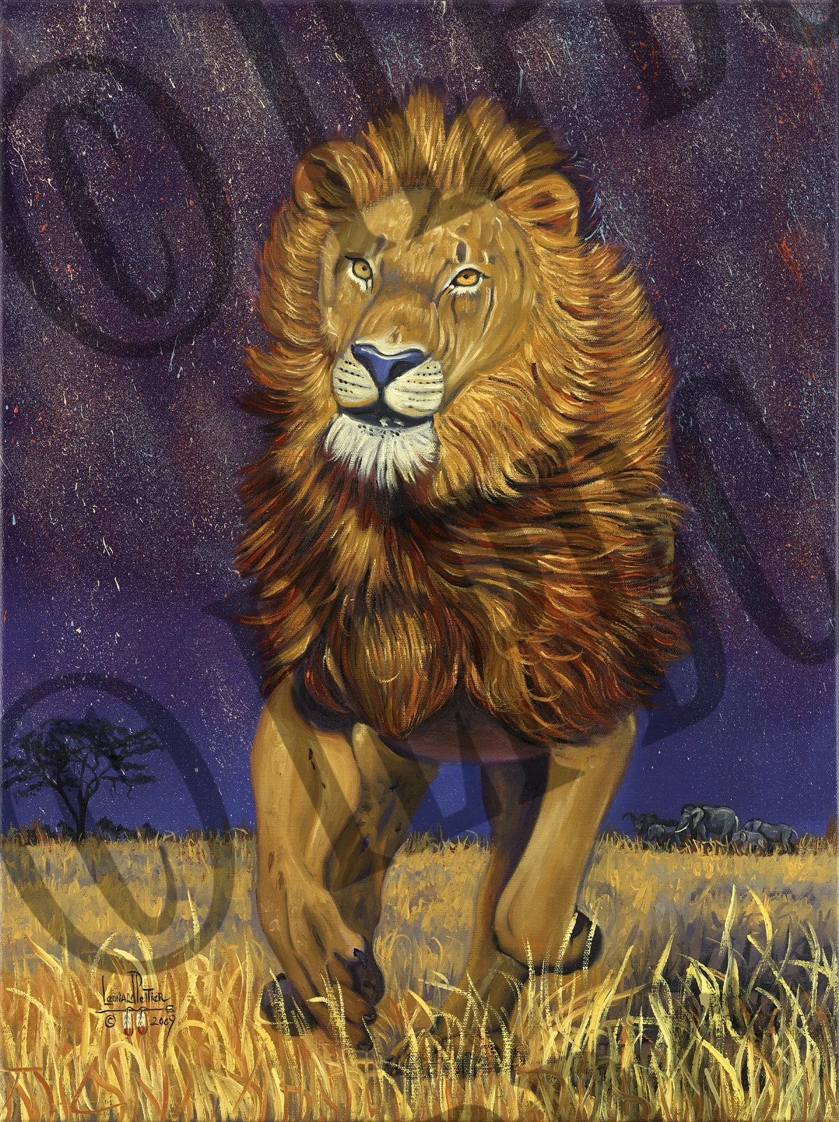 This striking painting captures a powerful lion in full stride across the vast savannah, set against a breathtaking starry night sky. The intense detail and dynamic composition create a sense of movement so vivid, it feels as though the lion could leap right out of the canvas. The contrast between the dark, celestial backdrop and the lion's golden mane emphasizes both the majesty and raw energy of this iconic predator, embodying strength, freedom, and the wild spirit of the natural world.