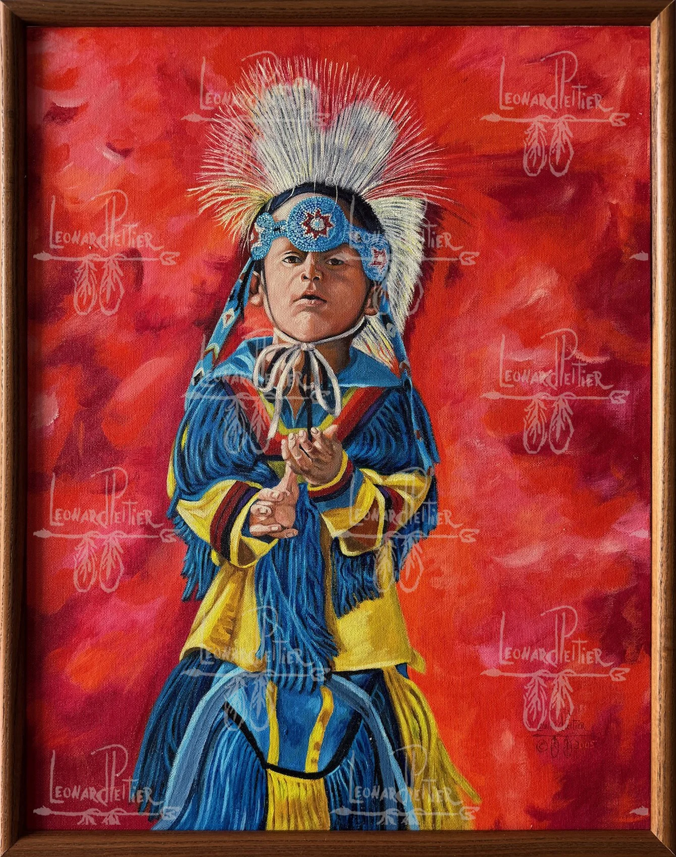 This striking portrait captures a young Native boy adorned in full powwow regalia, symbolizing cultural pride and tradition. Set against a vivid red background, the image highlights the intricate details of his attire and the profound significance of Indigenous heritage. The vibrant color evokes strength and resilience, emphasizing the enduring spirit of Native communities.